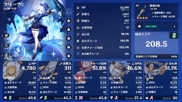 キャラ育成 【原神】フリーナのリビルドと聖遺物スコア200超え【静謐の笛】 【Before】現在のフリーナのビルドパッと見、まぁまぁ強そうなんですが、このビルドって結構いびつなんですよ。そもそも元チャ効率が低い。最低200前後は欲しい元チャ武器以外を選択すると、元素爆発を回す 2025.11.26 キャラ育成原神