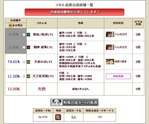 天之尾羽張と合成イベント 9月13日現在の特殊候補は"天之尾羽張"(あめのおはばり)です。 速度系スキルの比較 スキル名 確率 全攻 速度 備考 天香山命 100% 120% 90% ス...