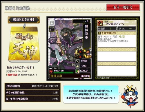 【戦国ixa】天神くじから降臨した雑賀孫市の育成計画【22章】 雑賀孫市降臨 自分でも一発でハズレ気味だと判断できました。 このカードがどうとか以前に、砲を使う気がなかったからなぁ。 まぁ、せっかくいらっしゃったので、孫市を...