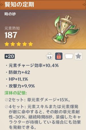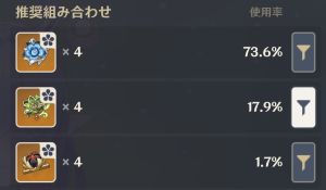 「金メッキ」や「元素チャージ効率+20%」「元素熟知+80」の2セット混合などでつなぐことも一考の余地はありです。しかし、他に深林役がいないなら、適当でも深林4セット装備の方がパーティー火力は出ます。