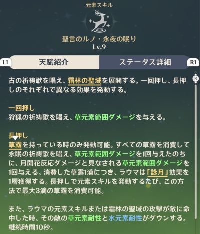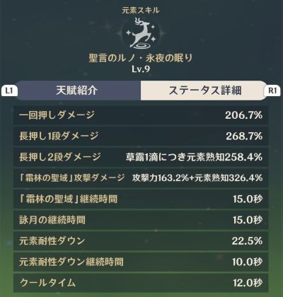 自キャラ中心に領域を展開し、2秒毎に1回のペースで草元素範囲ダメージを与え、その敵の草・水元素耐性をダウンするという非常に優秀な元素スキルです。