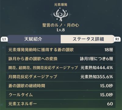 • 元素爆発使用時に元素スキルで獲得した「詠月」を消費し、「消費した詠月」×6のバフを追加で獲得(元素爆発と詠月で最大36回分)