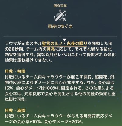 • 月兆・満照時(=ナドクライキャラが2人以上)だと、月開花反応ダメージの会心率+10%・会心ダメージ+20%