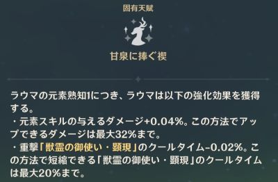 ラウマの元素熟知を基準に、開花系の反応に対して回数制限ありのダメージバフを配ります。