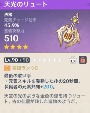 「元チャ効率45.9%」+元素スキルを撃つだけで「元素熟知+200」という強力な武器。
