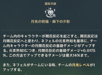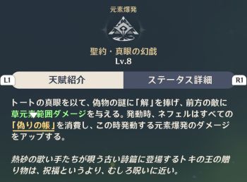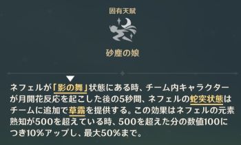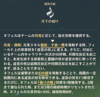 - 月兆・満照時にネフェルが元素スキルを使うと、草原核をロックし、反応・消滅させなくする
