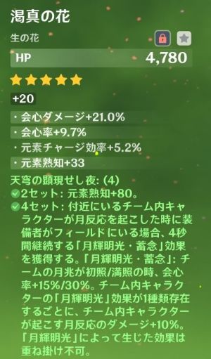 - 3つ吸収すると、元素熟知+100、継続時間8秒。継続時間がリセットされた時も同様の効果がある