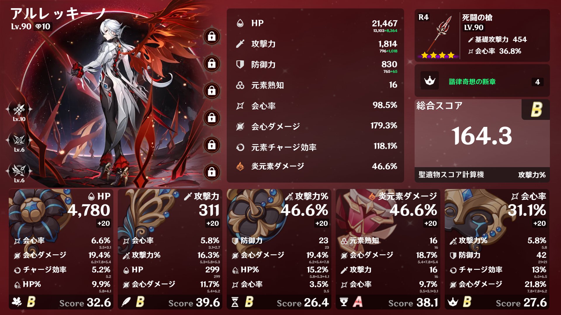 | キャラ | 武器 | 精錬 | 聖遺物 | チャージ |