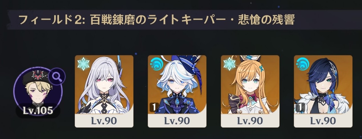 アイノの時計を熟知から元素チャージ効率に変えてから2戦目でクリアしました。やはり、知恵の溶炎を装備していても、アイノは時計チャージの方が安定します。