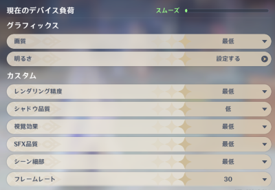 これぐらいの設定にすれば、イベントや日課の消化だけなら、SE2でも何ら問題なくプレイできます。(30分でバッテリーが40%ぐらい減りますけど…)