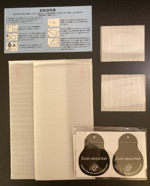 同梱物はこんな感じ。本体用とレンズ用が2枚入っているのは心強いですね。