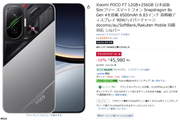 そんなこんなで、ブラックフライデーに購入したのがPOCO F7です。