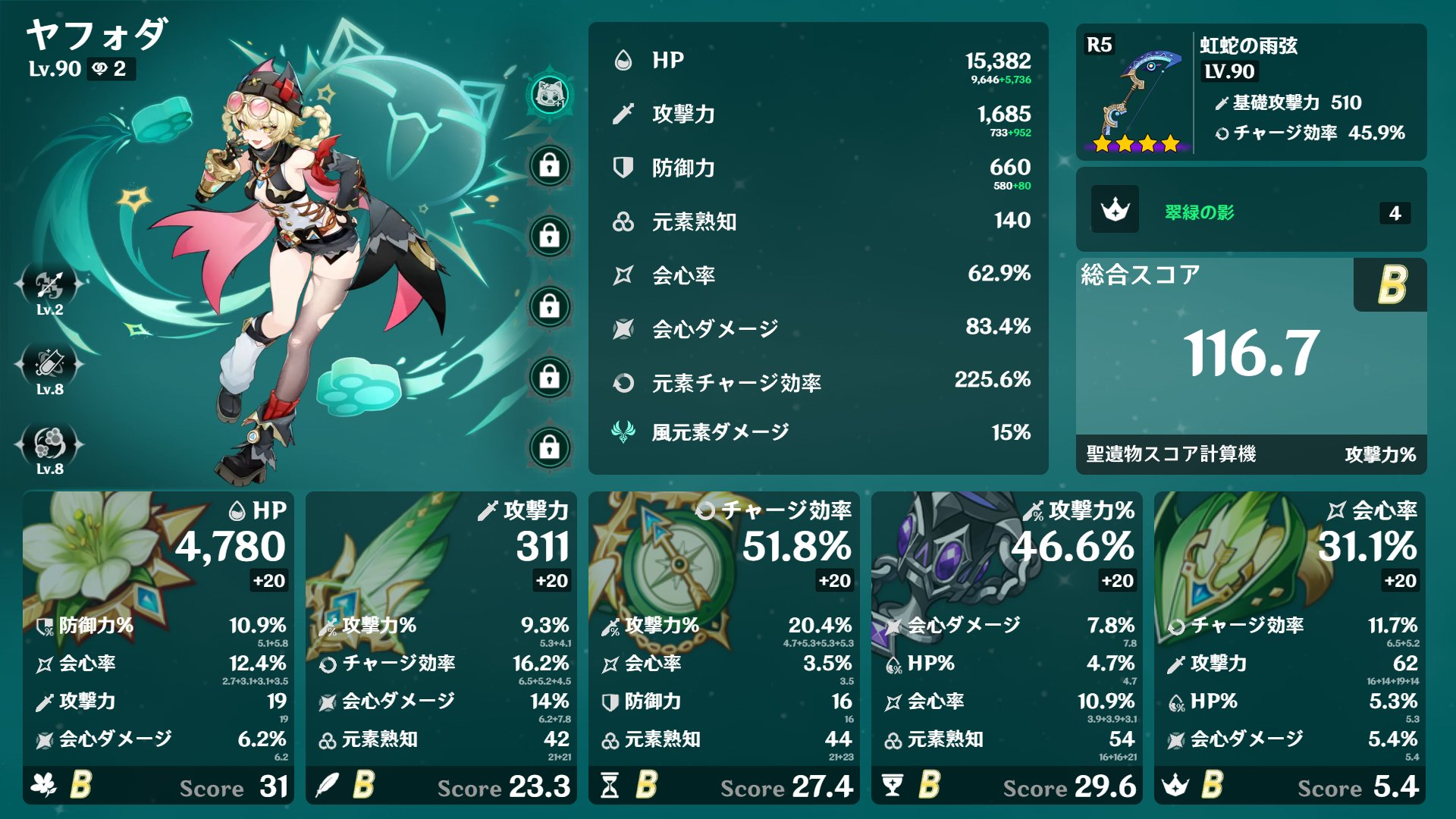 まずは元素チャージ効率確保(目安200%)最優先で、火力に関わる3つを厳選するという順番。