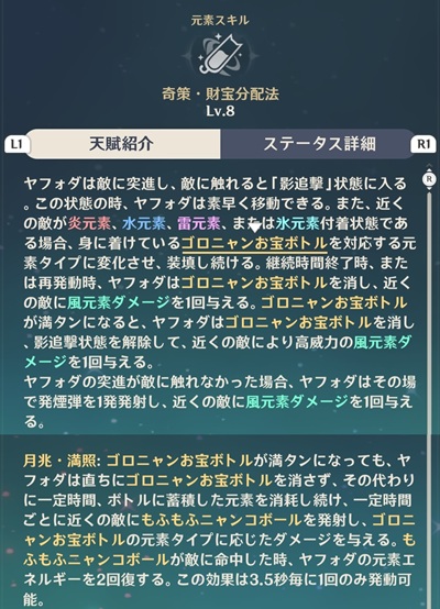 月兆・満照時だと、敵に付着した元素を「ゴロニャンお宝ボトル」に最大まで貯めれば、その元素で裏から「もふもふニャンコボール」で追撃をしてくれるという優れもの。