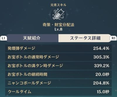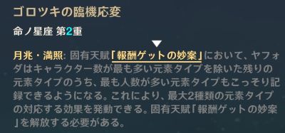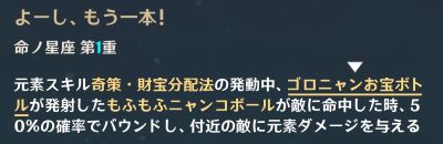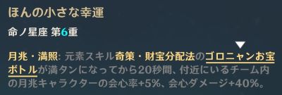 月兆・満照時に元素スキルの「ゴロニャンお宝ボトル」が貯まると、20秒間ナドクライキャラの「会心率+5%」「会心ダメージ+40%」