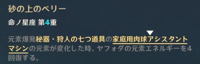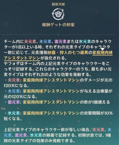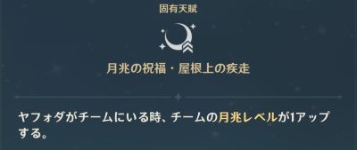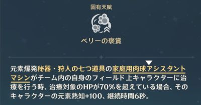 ヤフォダの元素爆発で回復した表のキャラクターのHPが70%以上であれば、そのキャラクターの元素熟知+100、という非常に分かりやすく強力なバフをくれます。