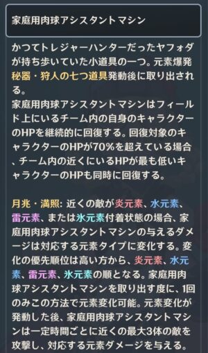 ちなみに、元素爆発の説明にも書いてある通り「家庭用肉球アシスタントマシン」の元素変化は1回限定です。
