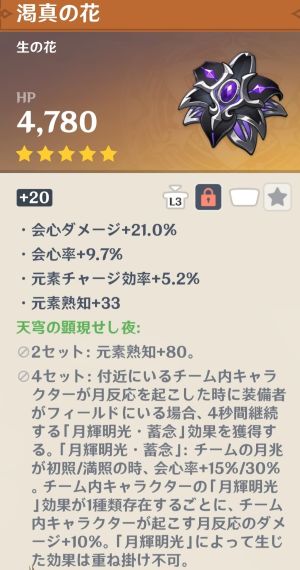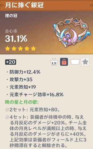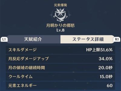 月反応ダメージにレベルは無関係ですが、(修正:失礼しました。普通に関係します)「固有天賦:月兆の祝福・汝に月光を授けん」によるダメバフ最大化のためにHPが35000必要です。