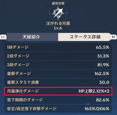 • 草露を所持している状態で重撃を放つと、割と強力な月開花反応ダメージを与える草元素アタッカー役にも