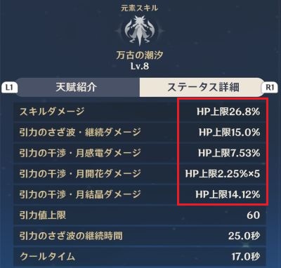 見ての通り、元素スキルに関する全ての攻撃がHP依存です。