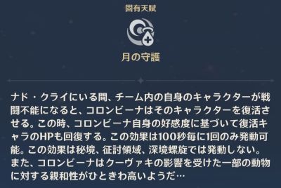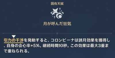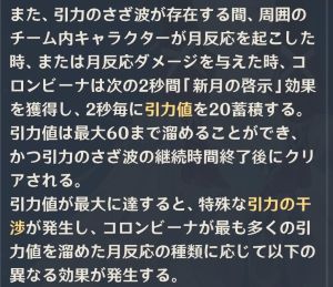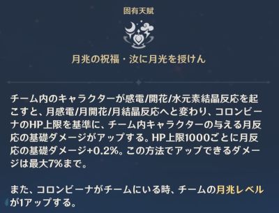 • コロンビーナのHPを基準に全ての月反応のダメージが上昇する(HP1000ごとに0.2%/7%が最大=HP35000)