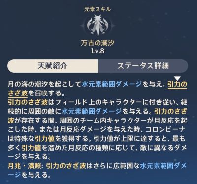 この元素スキル自体に強力な月反応ダメージを与える効果はありませんが、「引力値」が貯まるとドカンとかましてくれます。