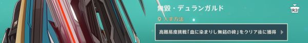 ファルカ専用の武器スキン「無毀・デュランガルド」の入手法は、用意された世界任務をクリアするだけなのですが、ゲーム内には「高難易度挑戦」や「強敵に立ち向かう」などと表記されています。