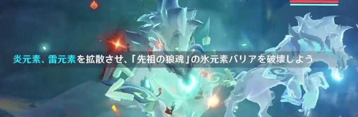 このログが表示されたら、向かって左側の本体に炎元素または雷元素を付着し、風元素で拡散させれば、簡単に右側のゲージ(バリア)を減らせます。このギミックの前後はガチるだけでOKです。