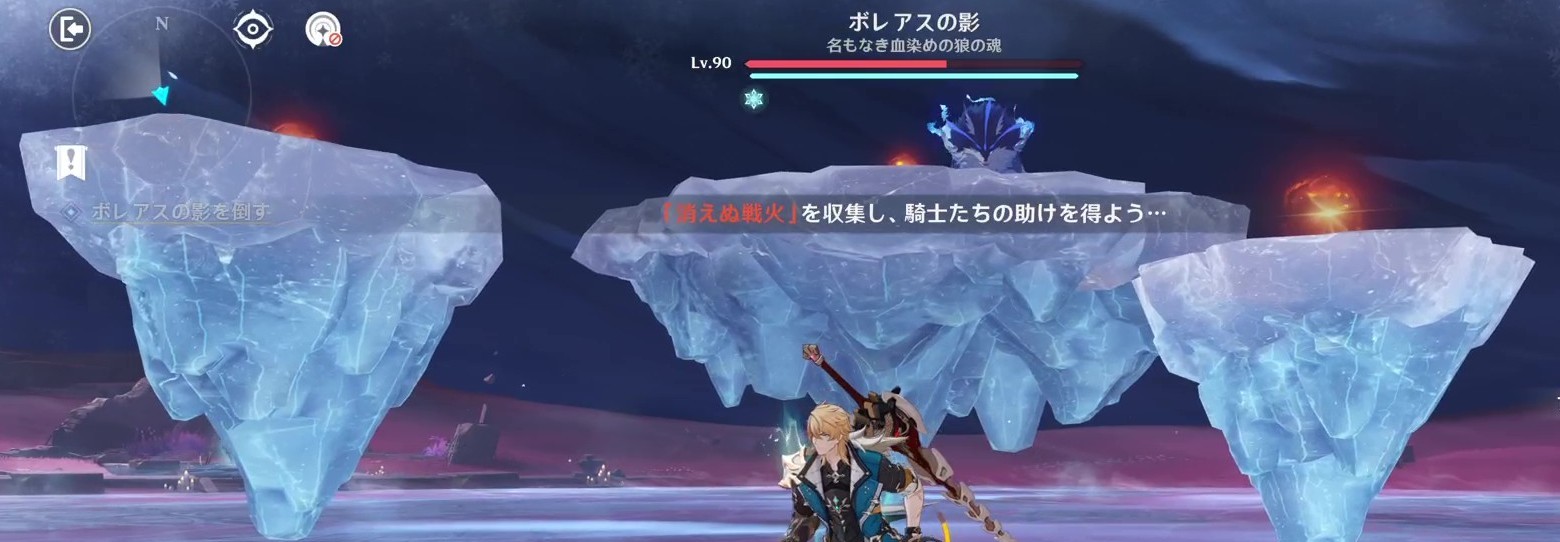 「ボレアスの影」のHPを残り6割まで削ったら、戦闘エリアの外周し始め、その後に自キャラへ向かって突進してきます。(モンド征討領域にいる元祖アンドレアスと同じ挙動)