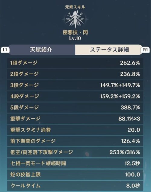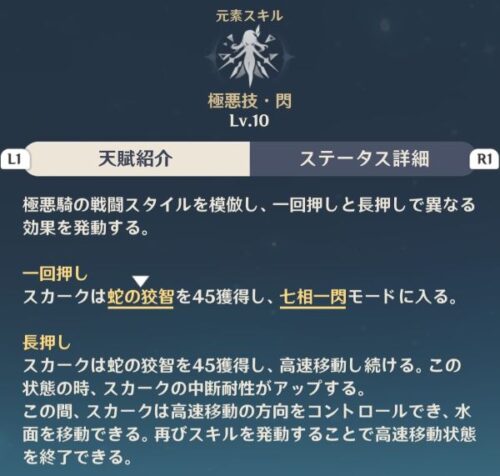 スカークの立ち回りの核となるメイン天賦です。一回押しでは継続戦闘に長けた「七相一閃」モード(通常攻撃型)へ、長押しでは瞬間火力を叩き出す「元素爆発型」へと性能が分岐します。
