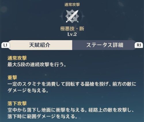 - 通常攻撃連打中に重撃を1回挟むことにより、継続時間を延ばすことが可能