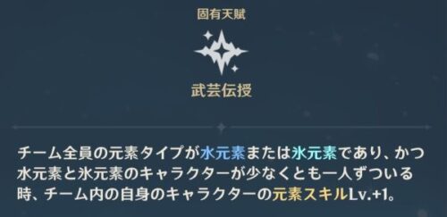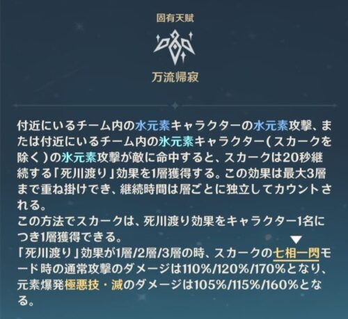 スカーク以外のチームメンバーが「水元素」または「氷元素」の攻撃を命中させると、最大3層まで累積する強力なバフ効果を獲得できます。