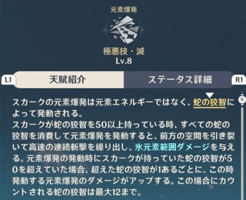 元素爆発にエネルギーを必要としないのがスカークの面白いところ。発動には専用ゲージ「蛇の狡知」を50以上貯める必要がありますが、元素チャージ効率に縛られないのは大きなメリットです。