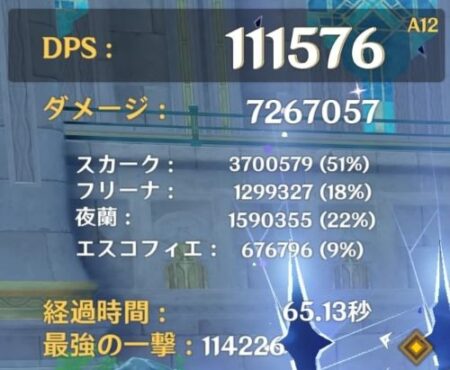 フリーナの代わりに、同じくダメージバフを配れる夜蘭を配置。DPSの平均は85,000前後でした。理想編成(10万超え)からは落ちますが、注目すべきはその「安定感」です。