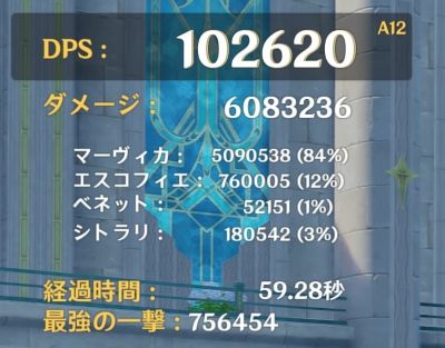 平均DPSは100,000前後。現環境トップクラスの火力が出ていますが、マーヴィカが1凸している点には留意してください。