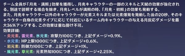 月兆・満潮時(ナドクライキャラ2人以上)に、非ナドクライキャラが元素スキルか元素爆発を発動すると、20秒間その発動したキャラクターの元素とステータスに応じて、月結晶反応ダメージが最大36%アップする強力な仕様があります。