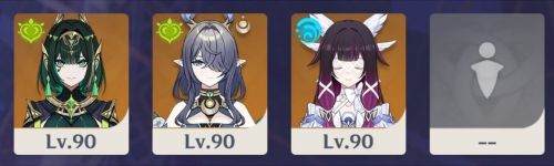 耐久枠(シールドやヒーラー)を捨てて、ナヒーダを4枠目に入れた反則編成です。本来はラウマが1凸していないと機能しないのですが、今回はお試しで計測してみました。
