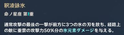 | おすすめ 聖遺物 | 「攻撃力+18%」 「氷元素+15%」(氷風・深廊) 「元素爆発+20%」(旧貴族) 上記からの2セット混合 |