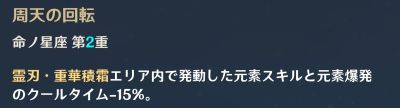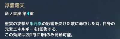 - 耐性ダウン:エリアが消えた時、付近の敵を自動で攻撃し、その敵の氷元素耐性を-10%ダウン