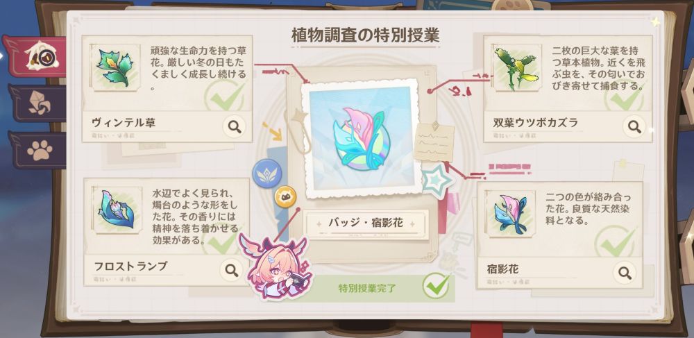 その特別授業は、普通に生息している植物や鉱物などを採取するわけではありません。図鑑に載っている各植物を選択し、世界地図に表示されたマーカーで「調査開始」を選択すると、付近で採取できるお手軽仕様となっています。そして、4つの調査を終えると特別授業が受けられます。