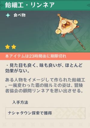 そして、「特別授業」をクリアすると「飴細工・リンネア」という謎の食べ物をもらえます。