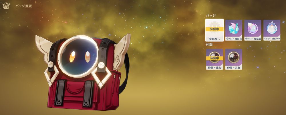 左が初期状態、右が「仲間・共有」と「バッジ・カピバラ」を付けた状態です。