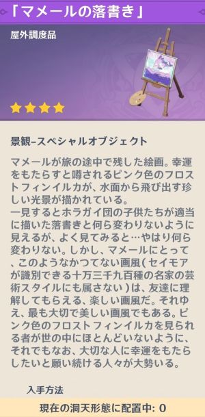 その後、調度品「マメールの落書き」をもらって、この世界任務は終了です。