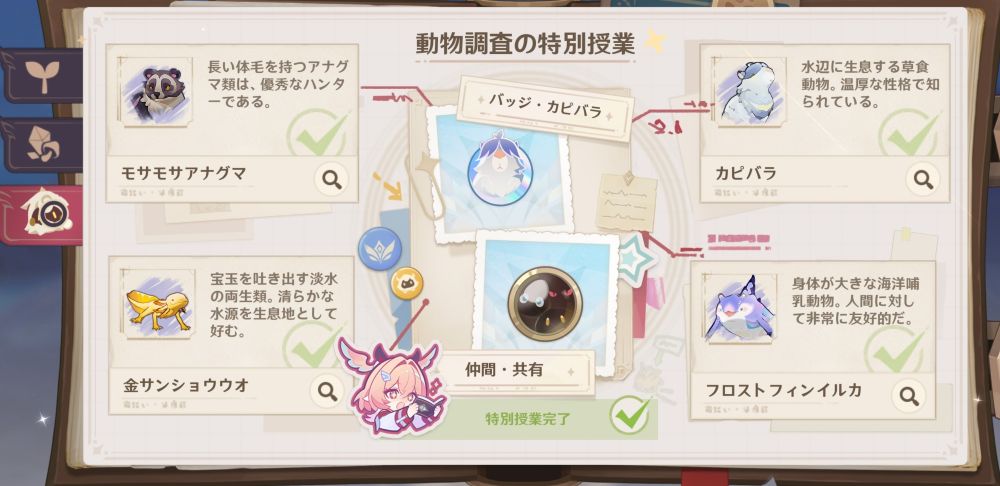 | 動物 調査 | 107,500 | 10 | 20 | バッジ・カピバラ 仲間・共有 |