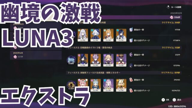 原神 【原神】幽境の激戦(Luna3/エクストラ)をクリア!【動画あり】 【Luna3】幽境の激戦・エクストラをクリア!合計時間は336秒。まぁ、いつも通りの時間ですね。一番上の「深罪の浸礼者」は、スカークパーティーで瞬殺だったものの、残りがシュヴルーズの奪い合い(シュヴル 2025.12.12 2025.12.14 原神幽境の激戦